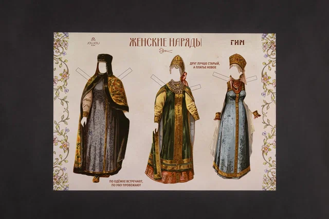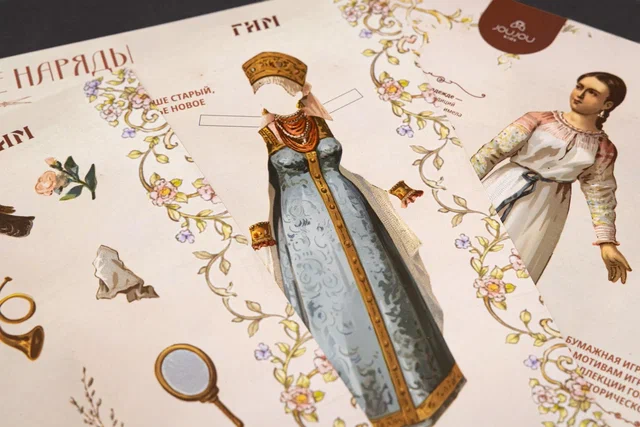 2 детально прорисованные бумажные куклы; 6 нарядов, отражающих ключевые элементы русского костюма — от сарафана и кокошника до праздничных рубах и кольчуг; аксессуары, позволяющие детям создавать выразительные и аутентичные образы.
