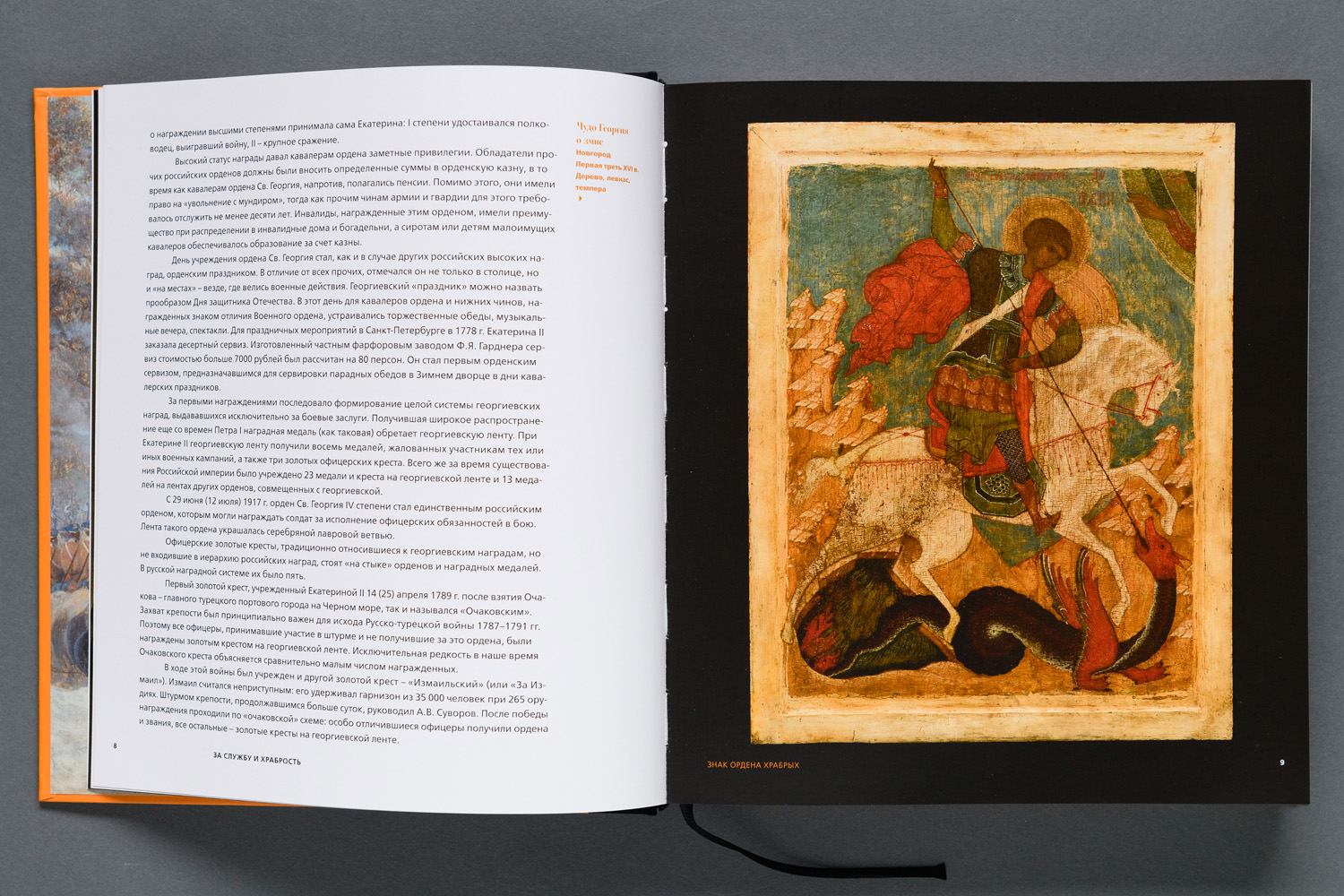 Издание, подготовленное к 250-летию со дня учреждения Св. Георгия — высшей воинской награды Российской империи, рассказывает об истории учреждения ордена, его роли в наградной системе государства, о боевых заслугах георгиевских кавалеров, прославивших русские армию и флот, о возрождении этого символа воинской доблести и чести в современной России. Среди уникальных предметов, вошедших в каталог, — Статут ордена, орденские знаки отличия, портреты героев, наградное Георгиевское оружие. Многие экспонаты публикуются впервые.